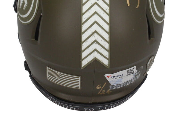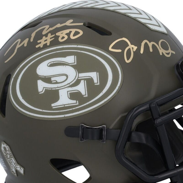 This san francisco 49ers salute to service speed mini helmet has been personally hand-signed by joe montana and jerry rice. it comes with an individually numbered, tamper-evident hologram from fanatics authentic. to ensure authenticity, the hologram can be reviewed online. this process helps to ensure that the product purchased is authentic and eliminates any possibility of duplication or fraud.this helmet is limited to 24 and you are bidding on a random number from the edition.