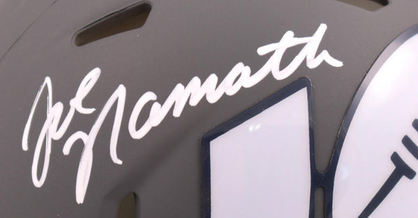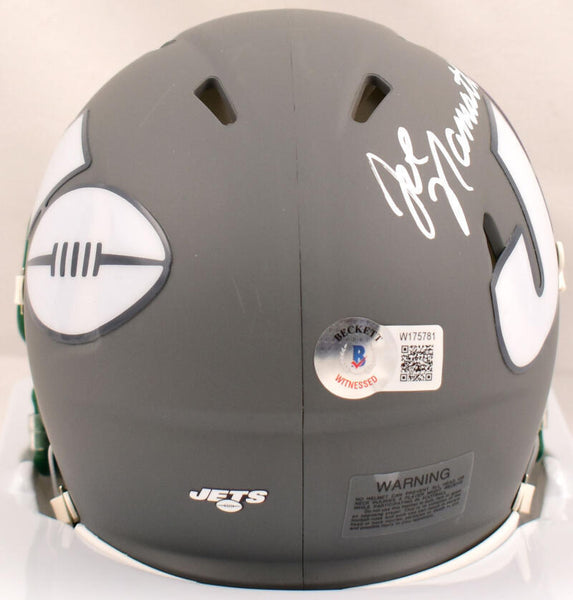 Joe Namath Autographed New York Jets Amp Speed Mini Helmet-Beckett W Hologram *White This is a hand autographed Helmet of Joe Namath of the New York Jets. This is a Riddell Football Amp Speed Mini Helmet. This item has a Beckett Witness Authentication, which comes with a numbered sticker hologram and a QR code for verification. You can view this item on the Beckett Authentication website. It was signed either at a public autograph appearance or a private signing. This is a stock photo of the item. Although you may not receive this exact item, the item you receive is virtually identical and brand new in great shape.