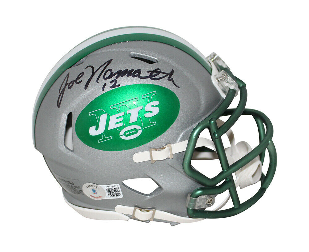 Joe Namath Autographed New York Jets Blaze Mini Helmet Beckett BAS 33368 The number in the listing title is just an inventory sku for our records and is not the authentication number. This is a New York Jets Blaze mini helmet that was personally autographed by Joe Namath. Includes a certificate of authenticity from Beckett Authentication Services (BAS) and Denver Autographs.