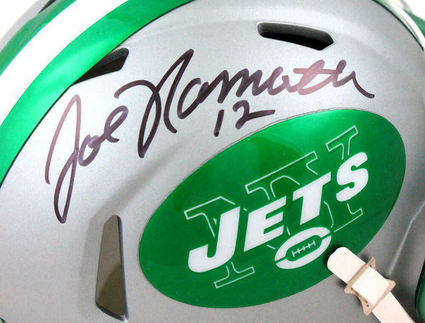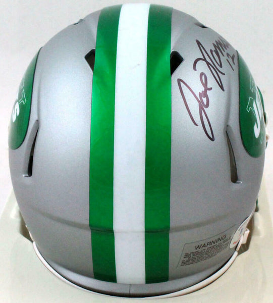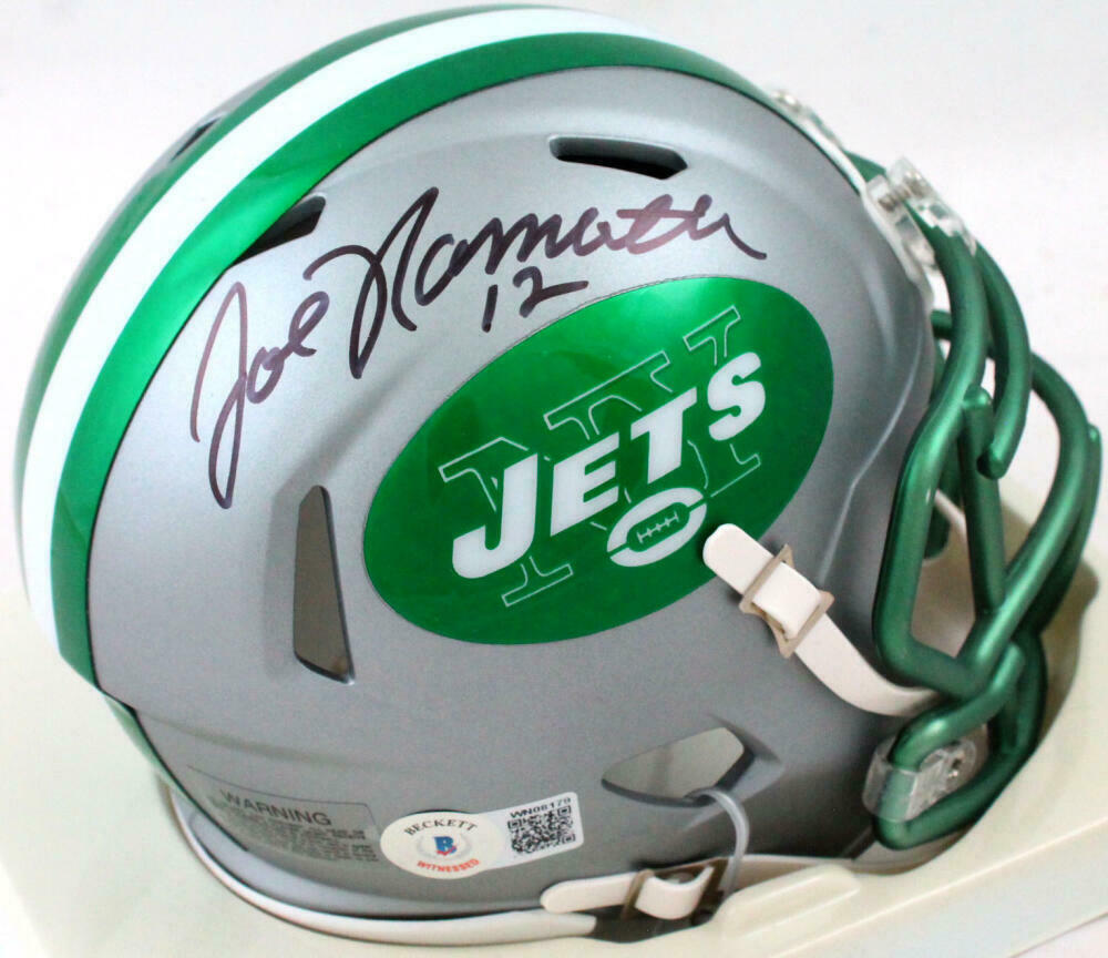 Joe Namath Autographed New York Jets Blaze Speed Mini Helmet-Beckett W Hologram *Black This is a hand autographed Helmet of Joe Namath of the New York Jets. This is a Riddell Football Blaze Speed Mini Helmet. This item has a Beckett Witness Authentication, which comes with a numbered sticker hologram and a generic Beckett Certificate of Authenticity. You can view this item on the Beckett Authentication website. It was signed either at a public autograph appearance or a private signing. This is a stock photo of the item. Although you may not receive this exact item, the item you receive is virtually identical and brand new in great shape.