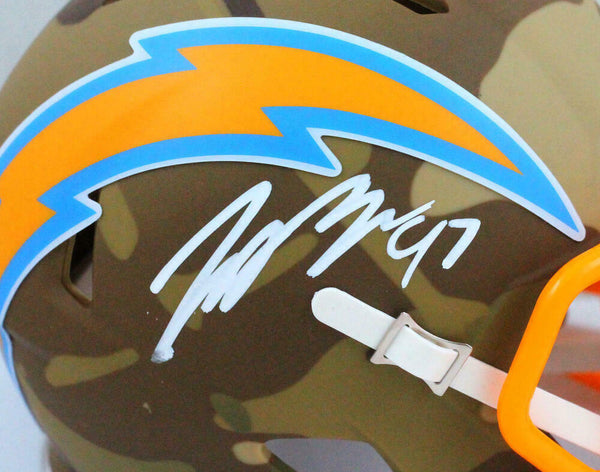 Joey Bosa Autographed LA Chargers Camo Mini Helmet- Beckett W *White This is a Joey Bosa of the Los Angeles Chargers hand autographed Riddell Football Camo Speed Mini Helmet. This item has a Beckett Witnessed Authentication, which comes with a numbered and a matching Beckett Certificate of Authenticity. You can view this item on the Beckett Authentication website and it shows when and where the item was signed. It was signed either at a public autograph appearance or a private signing. This is a stock photo of the item. Although you may not receive this exact item, the item you receive is virtually identical, brand new, and in great shape.