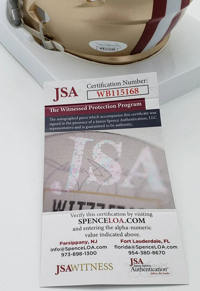 This autographed Riddell Speed mini helmet has been personally hand-signed by John Taylor of the San Francisco 49ers.This autograph is certified by James Spence Authentication's (JSA) Witnessed Protection Program. That means that a JSA representative was present when this item was signed. It comes with the numbered hologram and matching Certificate of Authenticity.