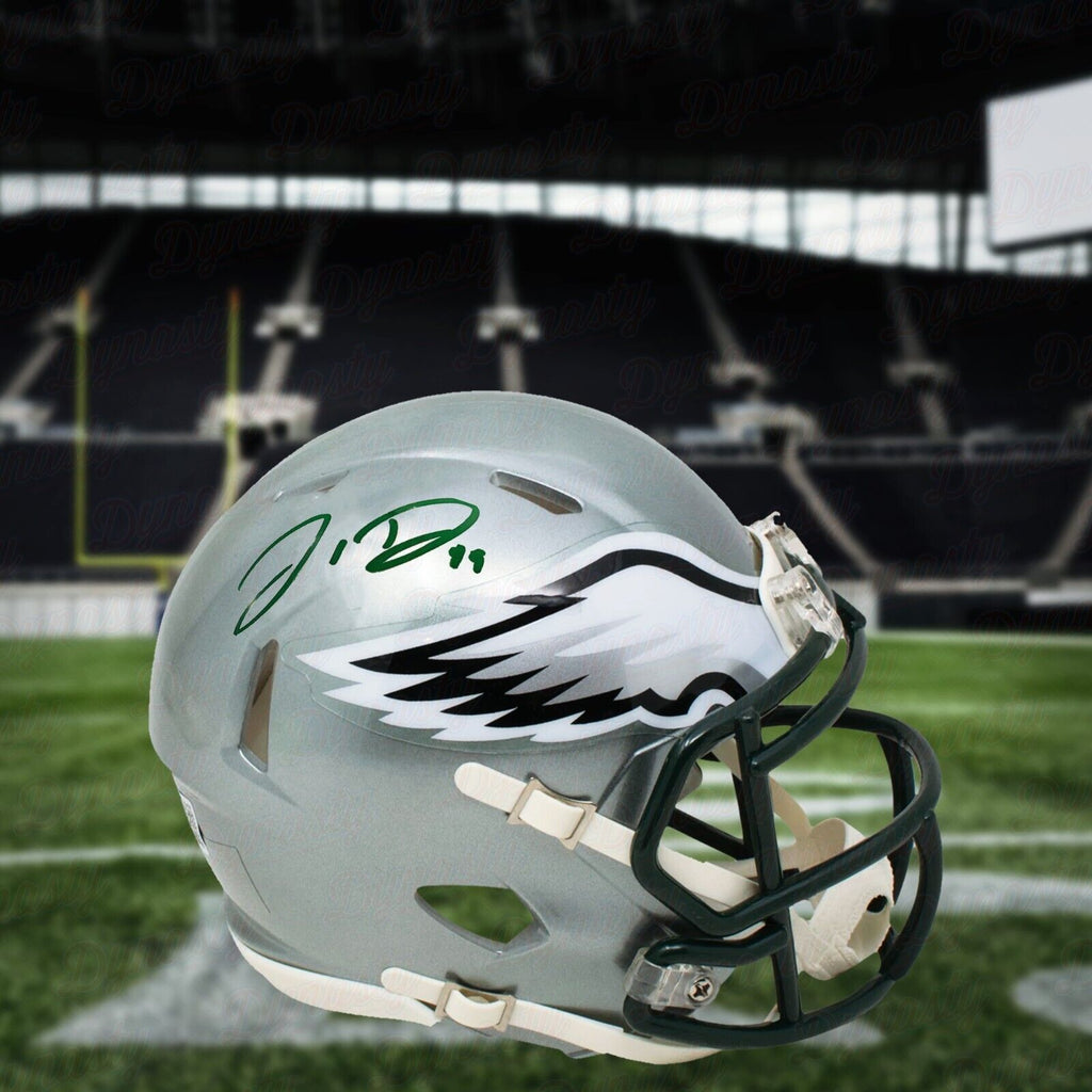 Jordan Davis Philadelphia Eagles Autographed Flash Mini-Helmet Autographed mini-helmet of Eagles star Jordan Davis - authenticated by James Spence Authentication (JSA) This officially licensed mini-helmet has been hand-signed by Eagles defensive star Jordan Davis. All autographed memorabilia comes with a certificate of authenticity and a matching hologram. Hand-Signed by Eagles defensive star Jordan Davis Signature is bold and clear on the mini-helmet Official NFL Riddell mini-helmet Includes JSA Signature Debut certificate of authenticity and matching hologram Stock image - customer will receive similar item