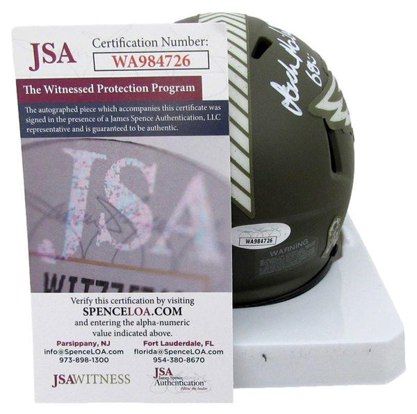 Jordan Mailata Autographed Mini Salute To Service Football Helmet Philadelphia Eagles. This helmet is authenticated by JSA and includes their tamper-proof sticker and Certificate of Authenticity.