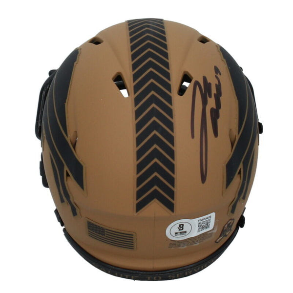 This Buffalo Bills Salute to Service Riddell mini speed helmet has been personally hand-signed by Josh Allen. It comes with an individually numbered, tamper-evident hologram from Beckett Authentic. To ensure authenticity, the hologram can be reviewed online. This process helps to ensure that the product purchased is authentic and eliminates any possibility of duplication or fraud.