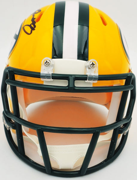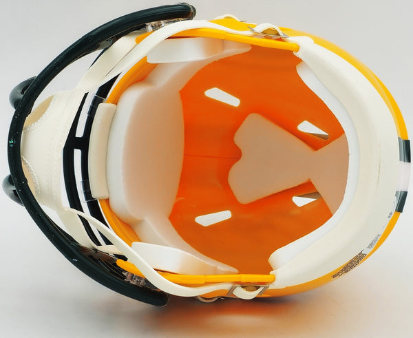 This is a Green Bay Packers Yellow Speed Mini Helmet that has been hand signed by Josh Jacobs. This item has been certified authentic by Beckett Authentication (BAS) and comes with their tamper-proof hologram.