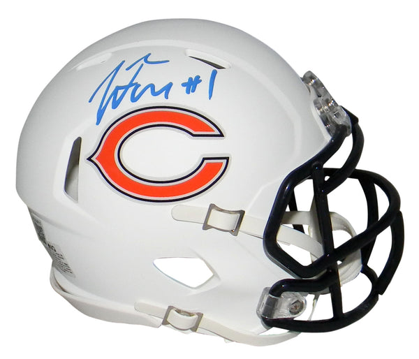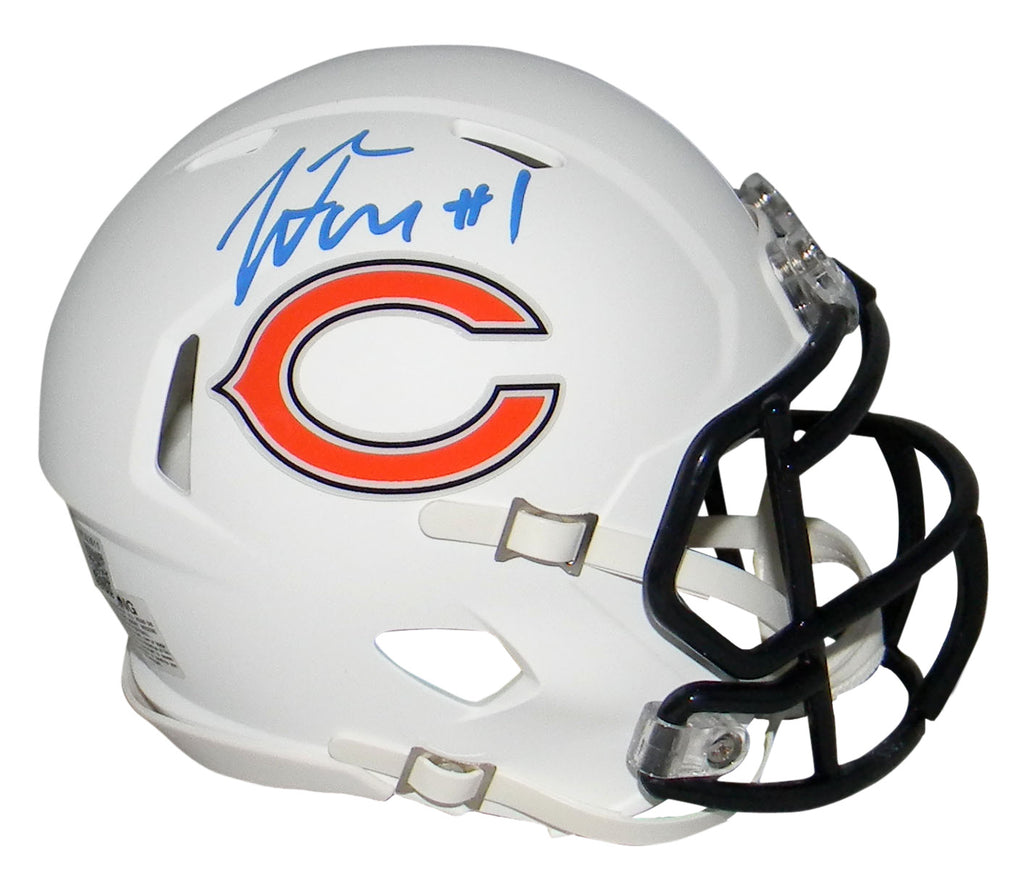 Justin Fields, former quarterback for the Chicago Bears, has hand signed this Bears Riddell Speed Flat White mini helmet at a private signing. This item is authenticated by Beckett Authentication Services, one of the best authenticators in the industry. Their tamper-evident hologram featuring a QR code and serial number is on the item. The authenticity can be verified online by entering the serial number or scanning the QR code.Item pictured may not be the exact item you will receive. It will be similar quality, and we guarantee your satisfaction.