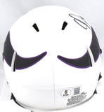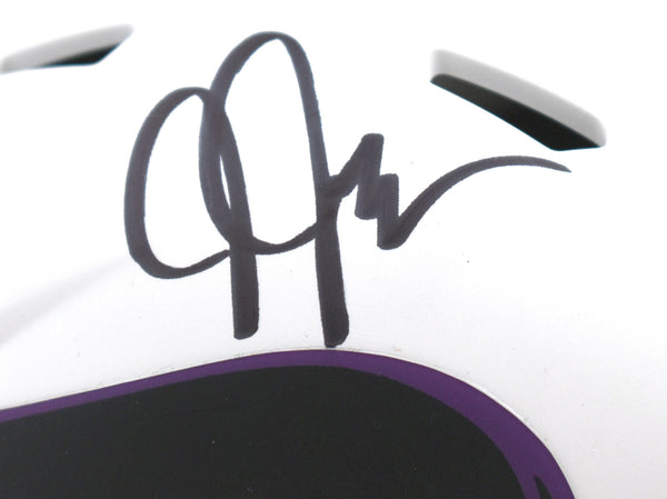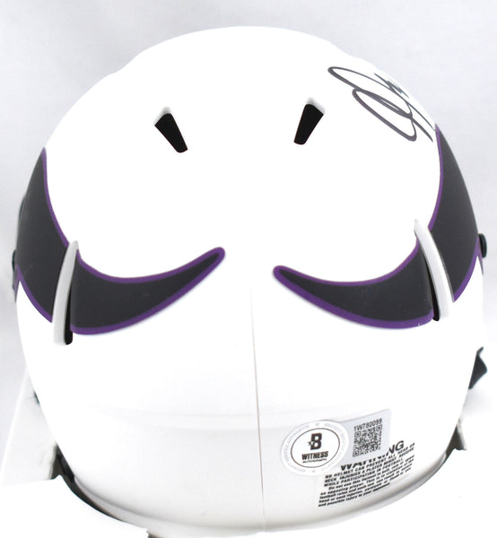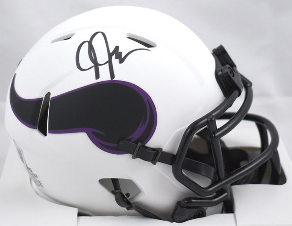 This is a hand autograph of Justin Jefferson of the Minnesota Vikings on a Riddell Football Lunar Speed Mini Helmet. This item has a Beckett Witnessed Authentication, which comes with a numbered sticker hologram and a QR code for verification. You can view this item on the Beckett Witnessed Authentication website and it shows when and where the item was signed. It was signed either at a public autograph appearance or a private signing. This is a stock photo of the item. Although you may not receive this exact item, the item you receive is virtually identical and brand new in great shape. This is a hand autograph of Justin Jefferson of the Minnesota Vikings on a Riddell Football Lunar Speed Mini Helmet. This item has a Beckett Witnessed Authentication, which comes with a numbered sticker hologram and a QR code for verification. You can view this item on the Beckett Witnessed Authentication website and it shows when and where the item was signed. It was signed either at a public autograph appearance or a private signing. This is a stock photo of the item. Although you may not receive this exact item, the item you receive is virtually identical and brand new in great shape.