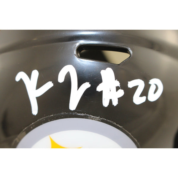 The number in the listing title is just an inventory sku for our records and is not the authentication number. The item pictured is a stock photo unless otherwise noted. This is a Pittsburgh Steelers Mini Helmet that was personally autographed by Kaleb Johnson. Includes a certificate of authenticity from Beckett Authentication Services (BAS) and Denver Autographs.