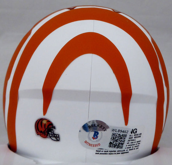 This is a Cincinnati Bengals White Lunar Eclipse Speed Mini Helmet that has been hand signed by Ken Anderson. There is a smudge in the signature as shown. The Eclipse helmets are very delicate and often have some marks or scratches on them. This item has been certified authentic by Beckett Authentication (BAS) and comes with their tamper-proof QR Code sticker that can be verified on the Beckett-authentication.com.