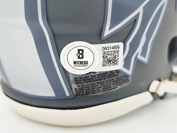 This is a Buffalo Bills Slate Gray Speed Mini Helmet that has been hand signed by Keon Coleman. This item has been witnessed and certified authentic by Beckett Authentication (BAS) and comes with their tamper-proof witness hologram.