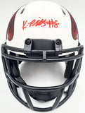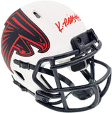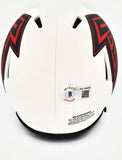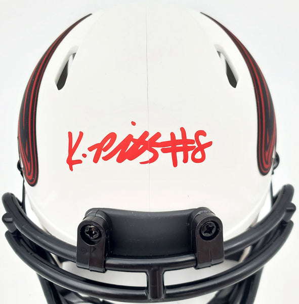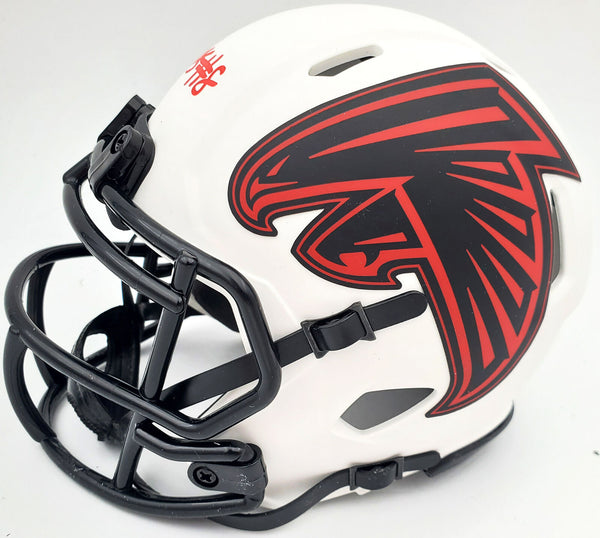 This is an Atlanta Falcons Lunar Eclipse White Speed Mini Helmet that has been hand signed by Kyle Pitts. The Eclipse helmets are very delicate and often have some marks or scratches on them. This item has been certified authentic by Beckett Authentication (BAS) and comes with their tamper-proof QR Code sticker that can be verified on the Beckett-authentication.com.