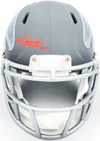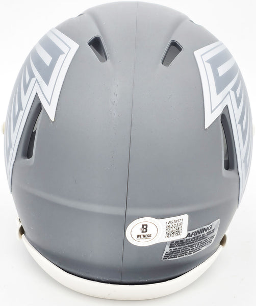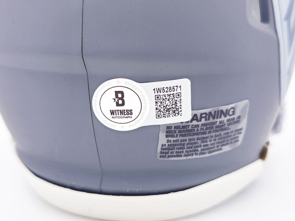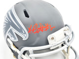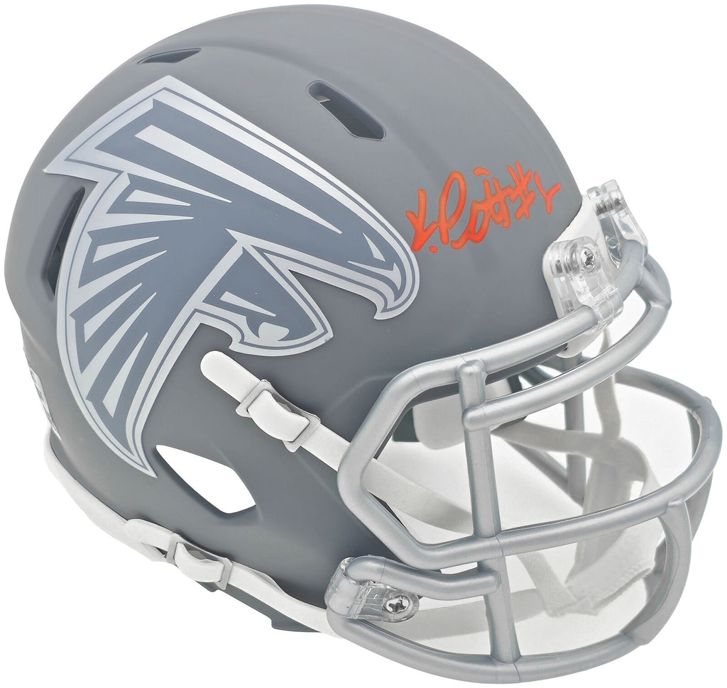 This is an Atlanta Falcons Slate Gray Speed Mini Helmet that has been hand signed by Kyle Pitts. This item has been witnessed and certified authentic by Beckett Authentication (BAS) and comes with their tamper-proof witness sticker.
