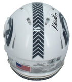 This Los Angeles Rams 2024 Salute to Service mini speed helmet has been personally hand-signed by Super Sports Center exclusive athlete, Kyren Williams. It comes with an individually numbered, tamper-evident hologram from Beckett Authentic. To ensure authenticity, the hologram can be reviewed online. This process helps to ensure that the product purchased is authentic and eliminates any possibility of duplication or fraud.