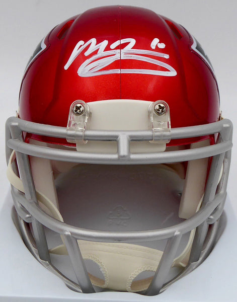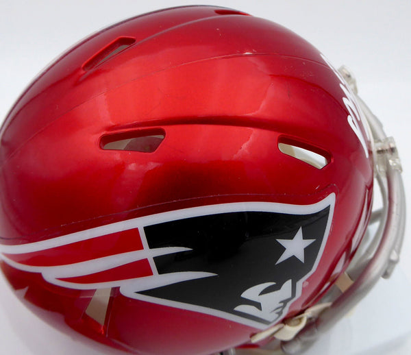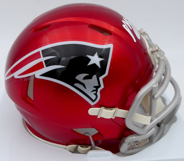 This is a New England Patriots Flash Red Speed Mini Helmet that has been hand signed by Mac Jones. The Flash helmets are very delicate and often have some marks or scratches on them. This item has been certified authentic by Beckett Authentication (BAS) and comes with their tamper-proof QR Code sticker that can be verified on the Beckett-authentication.com.A NOTE: The mini helmet has a chip on it, as shown in the pictures.