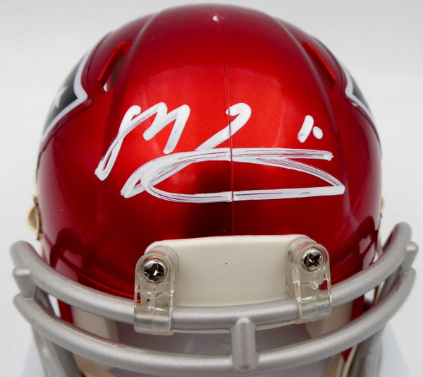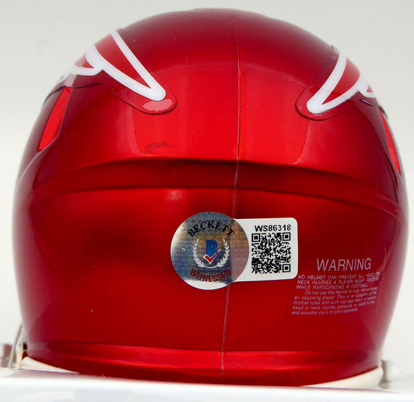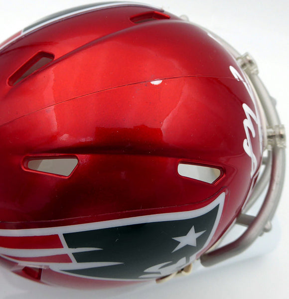 This is a New England Patriots Flash Red Speed Mini Helmet that has been hand signed by Mac Jones. The Flash helmets are very delicate and often have some marks or scratches on them. This item has been certified authentic by Beckett Authentication (BAS) and comes with their tamper-proof QR Code sticker that can be verified on the Beckett-authentication.com.A NOTE: The mini helmet has a chip on it, as shown in the pictures.
