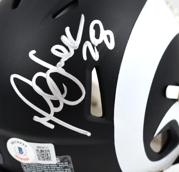 Marshall Faulk Autographed Rams Flat Black Speed Mini Helmet-Beckett W Hologram *Silver This is a Marshall Faulk of the St. Louis Rams hand autographed Riddell Flat Black Speed mini helmet. This item has a Beckett Witnessed Authentication, which comes with a numbered hologram and a QR code for verification. You can view this item on the Beckett Authentication website, it shows when and where the item was signed. It was signed either at a public autograph appearance or a private signing. This is a stock photo of the item. Although you may not receive this exact item, the item you receive is virtually identical, brand new, and in great shape.