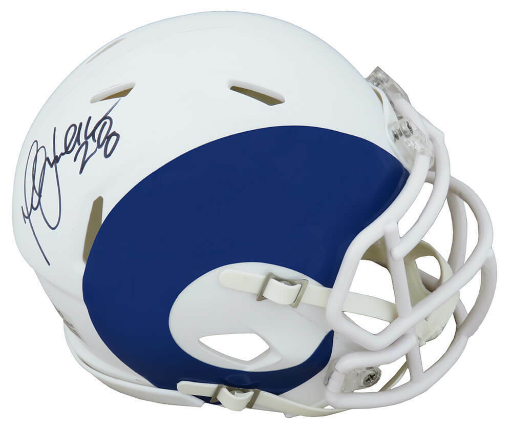 Marshall Faulk signed Rams AMP Alternate Series Riddell speed mini helmet. Item comes with a Schwartz Sports Memorabilia tamper evident numbered sticker and matching Certificate of Authenticity which can be verified online.