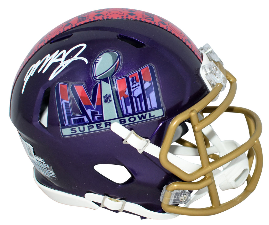 Mecole Hardman, star wide receiver for the Kansas City Chiefs, has hand signed this Super Bowl LVIII Riddell Speed mini helmet at a private signing. This item is authenticated by Beckett Authentication Services and was signed in the presence of one of their representatives. Their tamper-evident hologram featuring a QR code and serial number is on the item. The authenticity can be verified online by entering the serial number or scanning the QR code.Item pictured may not be the exact item you will receive. It will be similar quality, and we guarantee your satisfaction.