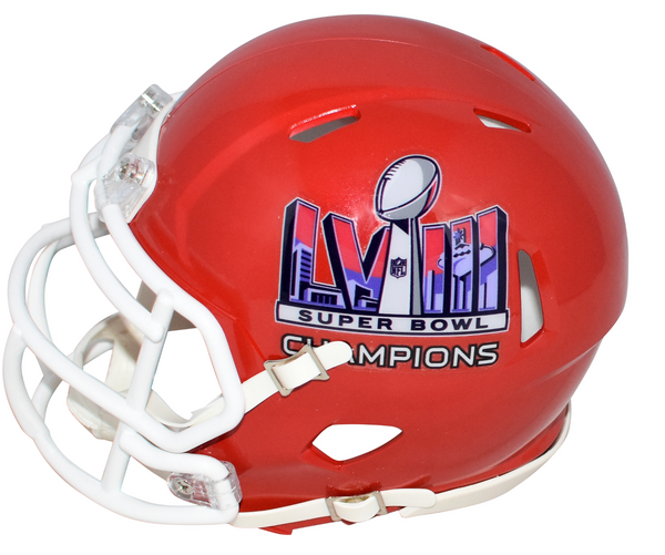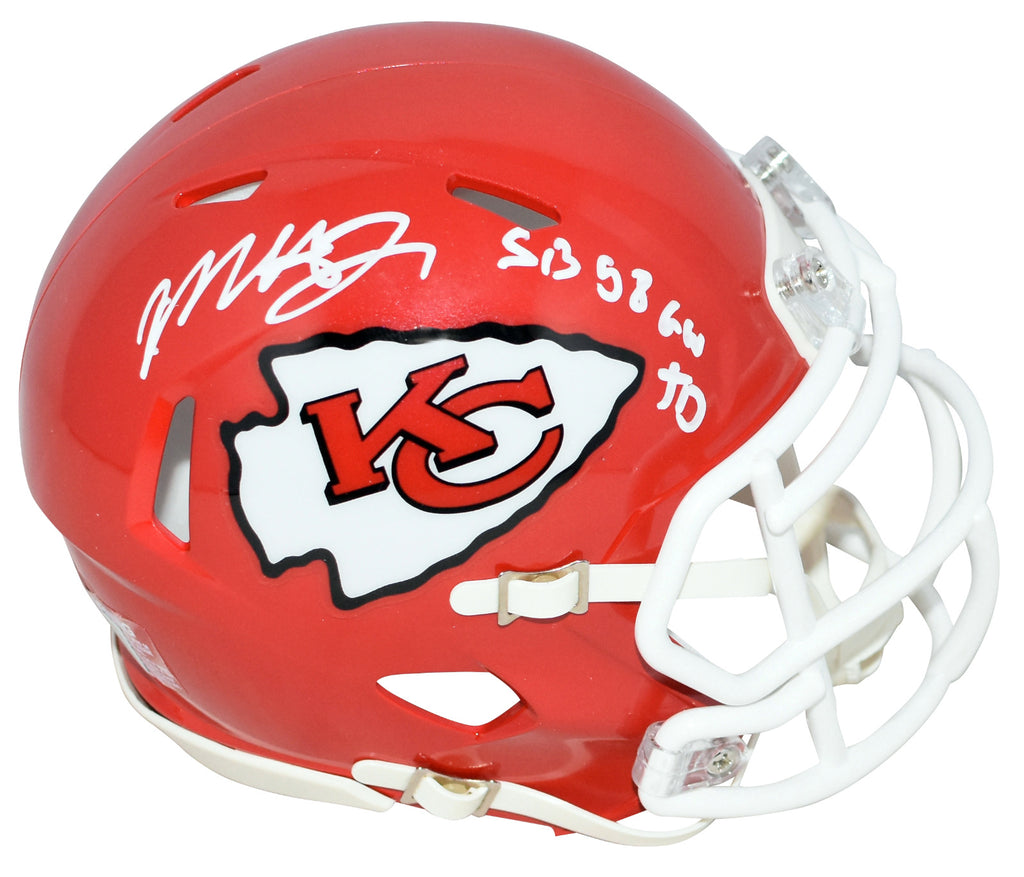 Mecole Hardman, star wide receiver for the Kansas City Chiefs, has hand signed this Chiefs Riddell Speed mini helmet with the Super Bowl LVIII logo on one side. He included the inscription "SB 58 GW TD" with his signature. This item is authenticated by Beckett Authentication Services and was signed in the presence of one of their representatives. Their tamper-evident hologram featuring a QR code and serial number is on the item. The authenticity can be verified online by entering the serial number or scanning the QR code.Item pictured may not be the exact item you will receive. It will be similar quality, and we guarantee your satisfaction.