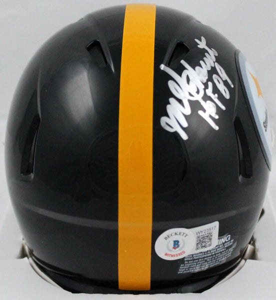 Mel Blount Autographed Steelers Speed Mini Helmet with HOF-Beckett W Hologram *Silver This is a Hand Autograph of Mel Blount of the Pittsburgh Steelers on a Riddell Football Speed Mini Helmet and inscribed with HOF 89. This item has a Beckett Witness Authentication, which comes with a Beckett #'ed hologram and a QR code for verification. You can view this item on the Beckett website, it shows when and where the item was signed. It was signed either at a public autograph appearance or a private signing. This is a stock photo of the item. Although you may not receive this exact item, the item you receive is virtually identical and brand new in great shape.