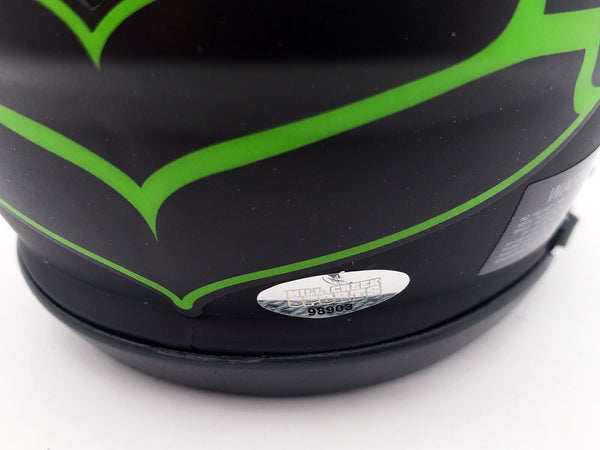 This is a Seattle Seahawks Eclipse Black Speed Mini Helmet that has been hand signed by Michael Dickson. The Eclipse helmets are very delicate and often have some marks or scratches on them. This item was signed in the presence of a Mill Creek Sports representative and comes with their serial numbered hologram and matching certificate of authenticity.