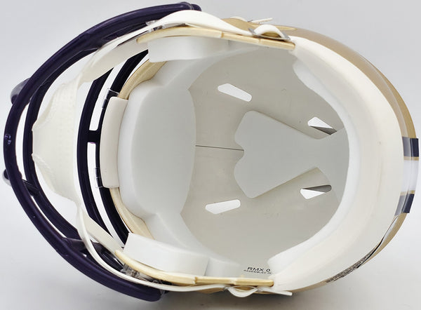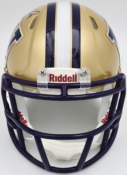 This is a Washington Huskies Gold Speed Mini Helmet that has been hand signed by Michael Penix Jr. This item has been witnessed and certified authentic by Beckett Authentication (BAS) and comes with their tamper-proof witness hologram.