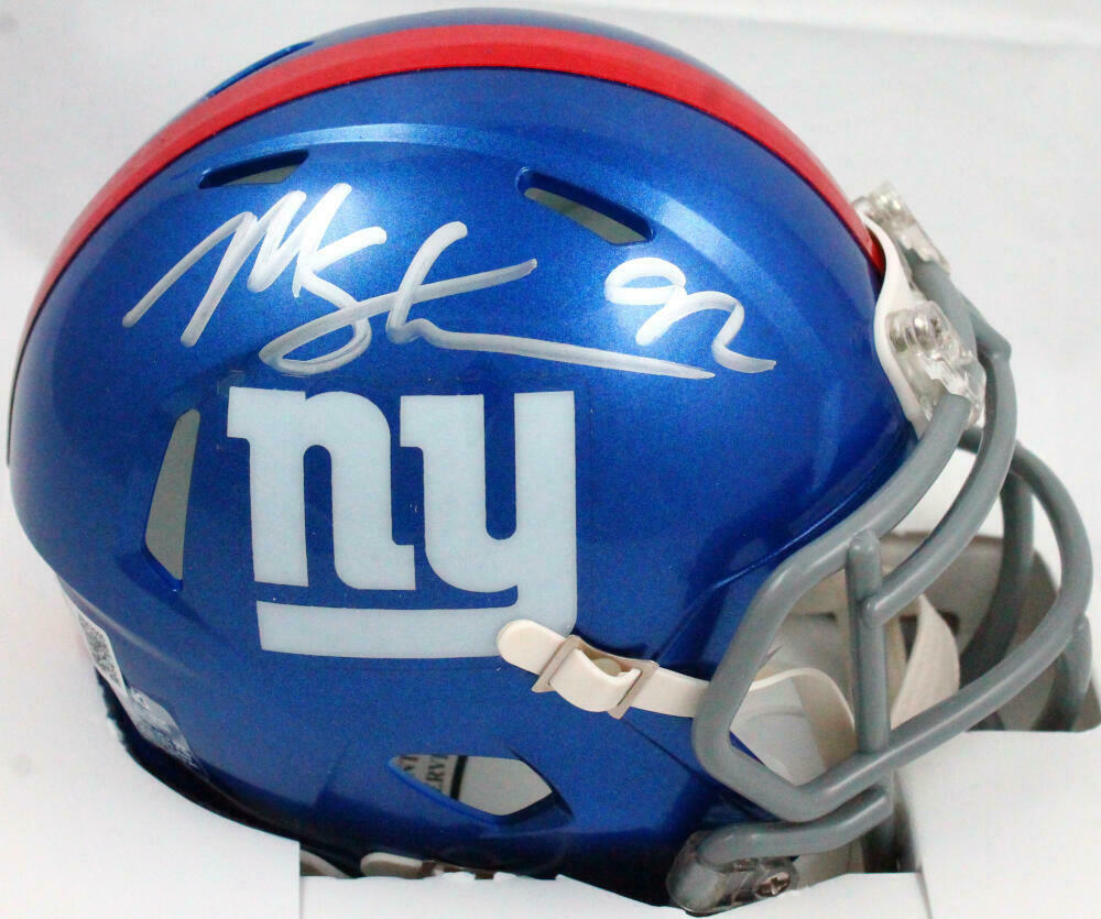 Michael Strahan Autographed New York Giants Speed Mini Helmet-Beckett W Hologram *Silver This is a hand autographed helmet of Michael Strahan of the New York Giants. This is a Riddell Football Speed Mini Helmet. This item has a Beckett Witnessed Authentication, which comes with a numbered hologram and a QR code for verification. You can view this item on the Beckett Authentication website and it shows when and where the item was signed. It was signed either at a public autograph appearance or a private signing. This is a stock photo of the item. Although you may not receive this exact item, the item you receive is virtually identical and brand new in great shape.