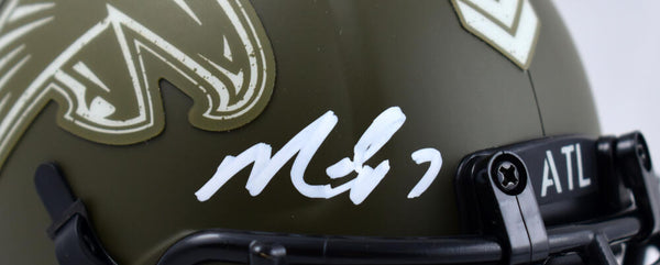 Michael Vick Autographed Falcons Salute to Service Speed Mini Helmet-Beckett W Hologram *White This is a hand autograph of Michael Vick of the Falcons on a Riddell Football Salute to Service Speed Mini Helmet. This item has a Beckett Witnessed Authentication, which comes with a Beckett numbered hologram and a QR code for verification. You can view this item on the Beckett website. It was signed either at a public autograph appearance or a private signing. This is a stock photo of the item. Although you may not receive this exact item, the item you receive is virtually identical and brand new in great shape.