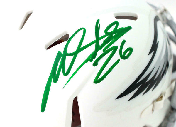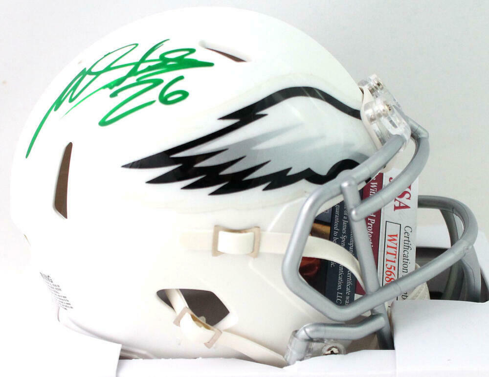 Miles Sanders Autographed Philadelphia Eagles Flat White Mini Helmet- JSA W Auth *Green This is a hand autograph of Miles Sanders of the Philadelphia Eagles on a Riddell Football Flat White Speed Mini Helmet. This item has a James Spence Witness Protection Authentication, which comes with a numbered sticker and a matching JSA Certificate of Authenticity. You can view this item on the SpenceLOA website and it shows when and where the item was signed. It was signed either at a public autograph appearance or a private signing. This is a stock photo of the item. Although you may not receive this exact item, the item you receive is virtually identical and brand new in great shape.