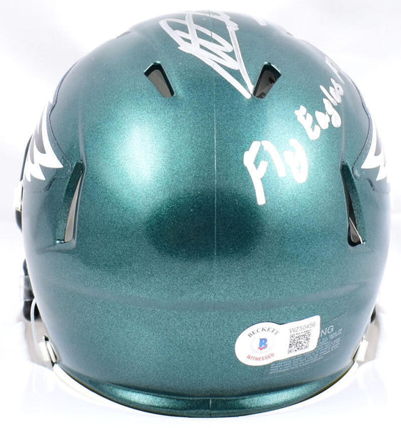 Miles Sanders Autographed Philadelphia Eagles Speed Mini Helmet w/Fly Eagles-Beckett W Hologram *Silver *Top This is a hand autograph of Miles Sanders of the Philadelphia Eagles on a Riddell Football Speed Mini Helmet. Inscribed Fly Eagles Fly. This item has a Beckett Witness Authentication, which comes with a Beckett numbered hologram and a QR code for verification. You can view this item on the Beckett website and it shows when and where the item was signed. It was signed either at a public autograph appearance or a private signing. This is a stock photo of the item. Although you may not receive this exact item, the item you receive is virtually identical and brand new in great shape.