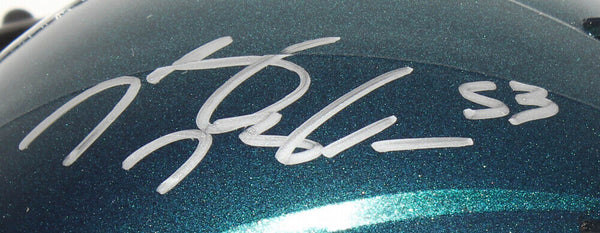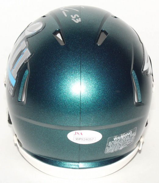 Riddell Eagles Super Bowl LII speed mini helmet. Hand-signed in silver paint pen by Nigel Bradham. The lot / autograph(s) includes an official James Spence Authentication (JSA) hologram and matching COA for authenticity purposes. The signing of this item was witnessed by JSA.Authentication: JSA COA