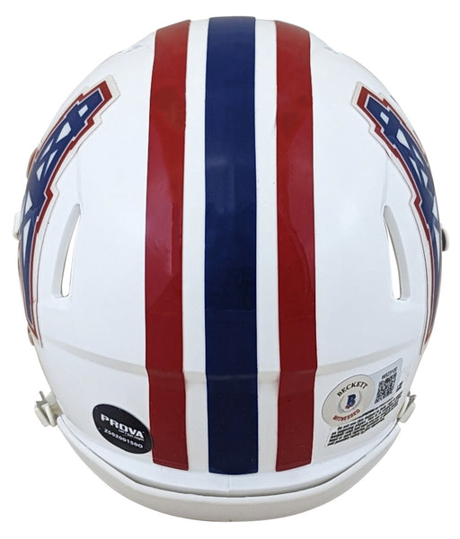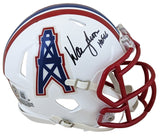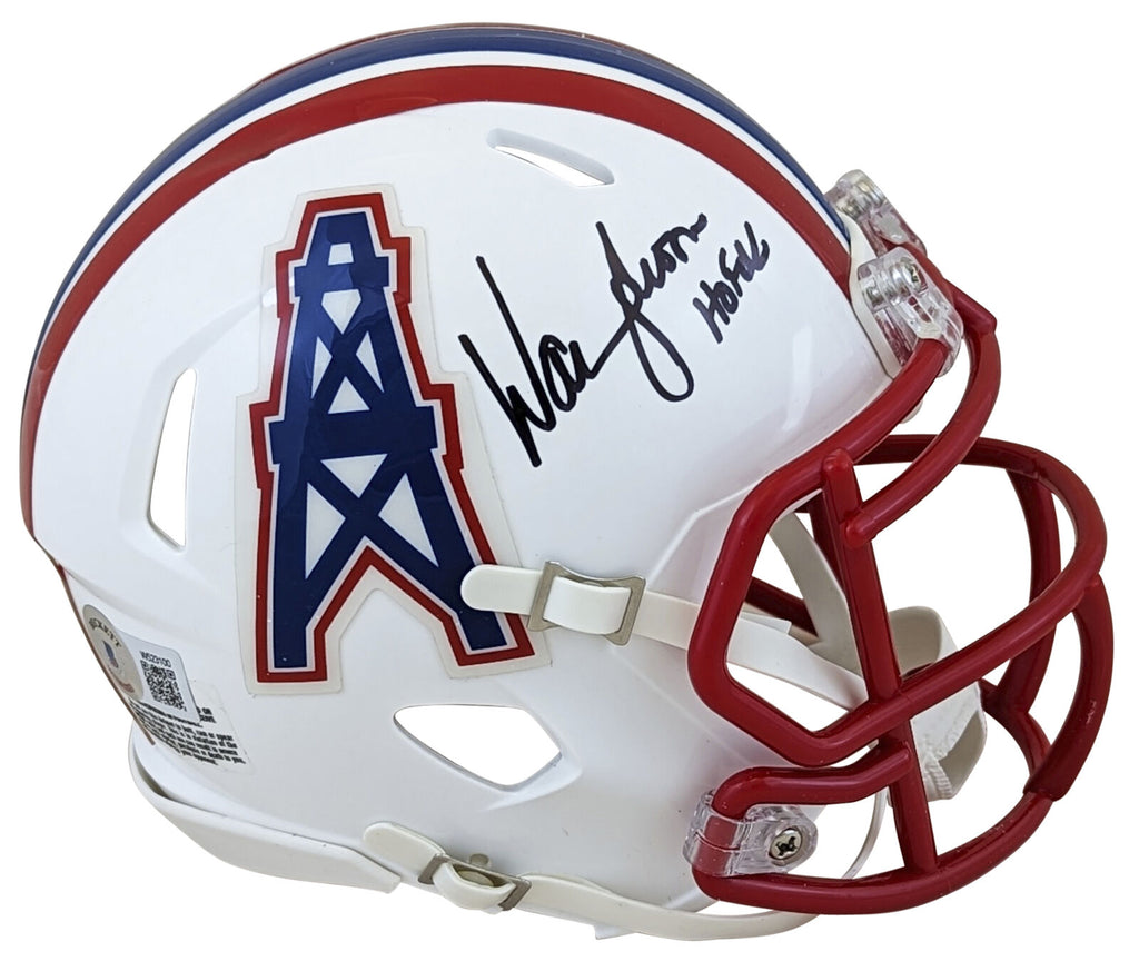 This Autographed 1981-98 Throwback Speed Mini Helmet with the inscription of "HOF 06" has been Personally Signed by Warren Moon of the Houston Oilers. This item is 100% Authentic to include a hologram by Beckett Authentication Services. This item will come with an affixed Beckett Authentication Services (BAS) authentication sticker, which includes a scannable QR code to verify authenticity. Please note that Beckett no longer provides serial-numbered COA cards, and the attached BAS sticker will serve as the complete authentication for this item. This is a BAS Witnessed Protection Program item which means a Beckett Authentication Service representative was present when this item was being signed. We conducted an autograph signing with Warren Moon where multiples of the same item were signed. While the photographs are representative of this item, the size, placement and strength of the signature may vary. Each item is hand signed, therefore, each autograph is unique. This item can be verified through BAS Witnessed.