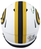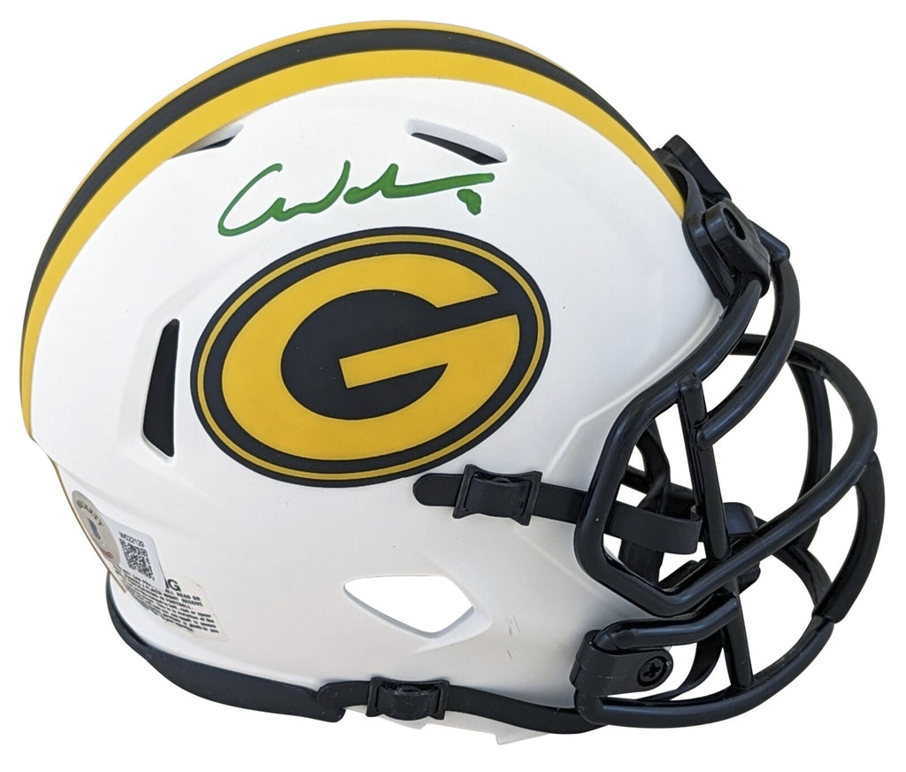This Autographed Alternate Lunar Speed Mini Helmet has been Personally Signed by Christian Watson of the Green Bay Packers. This item is 100% Authentic to include a hologram by Beckett Authentication Services. This item will come with an affixed Beckett Authentication Services (BAS) authentication sticker, which includes a scannable QR code to verify authenticity. Please note that Beckett no longer provides serial-numbered COA cards, and the attached BAS sticker will serve as the complete authentication for this item. This is a BAS Witnessed Protection Program item which means a Beckett Authentication Service representative was present when this item was being signed. We conducted an autograph signing with Christian Watson where multiples of the same item were signed. While the photographs are representative of this item, the size, placement and strength of the signature may vary. Each item is hand signed, therefore, each autograph is unique. This item can be verified through BAS Witnessed.