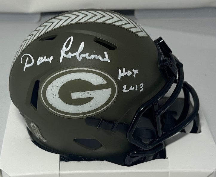 Riddell 2022 SALUTE TO SERVICE Speed Mini Helmet hand signed by Green Bay Packers Hall of Famer DAVE ROBINSON. The signature is in White paint pen with the inscription "HOF 2013". This item was signed at a private signing and would make a great addition to any Packers collection! This item is guaranteed to be 100% authentic and will include a COA hologram from from Beckett authentication.