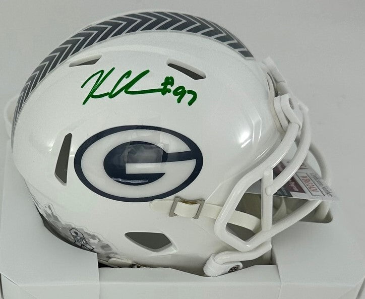 Riddell 2024 SALUTE TO SERVICE Speed Mini helmet hand signed by Green Bay Packers Pro Bowl Defensive Tackle KENNY CLARK. The signature i in Green paint pen. This item was signed at a private signing with us and would make a great addition to any Packers collection! This autograph is guaranteed to be 100% authentic and will include a COA from JSA authentication.