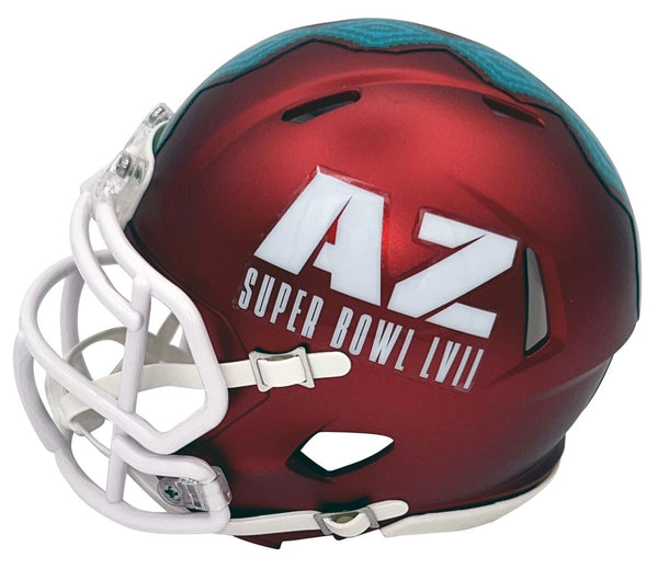 Patrick Mahomes, star quarterback for the Kansas City Chiefs, has hand signed this Super Bowl LVII Riddell Speed mini helmet at a private signing. This item is authenticated by Beckett Authentication Services and was signed in the presence of one of their representatives. Their tamper-evident hologram featuring a QR code and serial number is on the item. The authenticity can be verified online by entering the serial number or scanning the QR code.Item pictured may not be the exact item you will receive. It will be similar quality, and we guarantee your satisfaction.