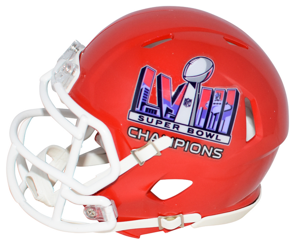 Patrick Mahomes, star quarterback for the Kansas City Chiefs, has hand signed this Chiefs Riddell Speed mini helmet with the Super Bowl LVIII logo on one side. This item is authenticated by Beckett Authentication Services and was signed in the presence of one of their representatives. Their tamper-evident hologram featuring a QR code and serial number is on the item. The authenticity can be verified online by entering the serial number or scanning the QR code.Item pictured may not be the exact item you will receive. It will be similar quality, and we guarantee your satisfaction.