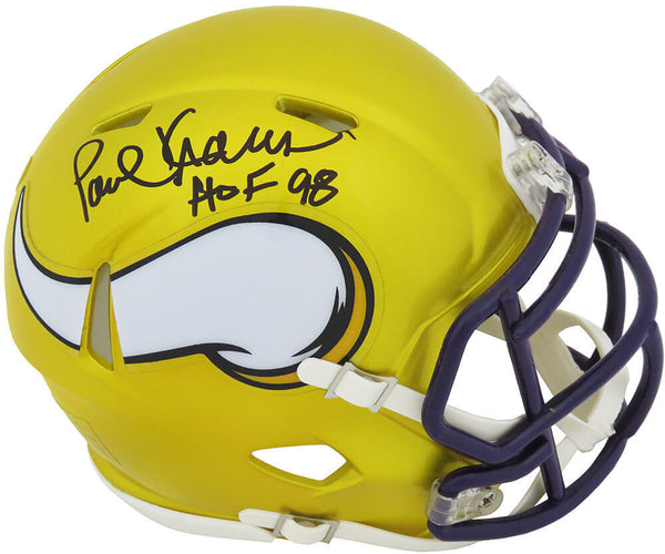 Paul Krause signed Minnesota Vikings Flash Riddell speed mini helmet with 'HOF 98' inscription. Item comes with a Schwartz Sports Memorabilia tamper-proof numbered hologram and Certificate of Authenticity which can be verified online.