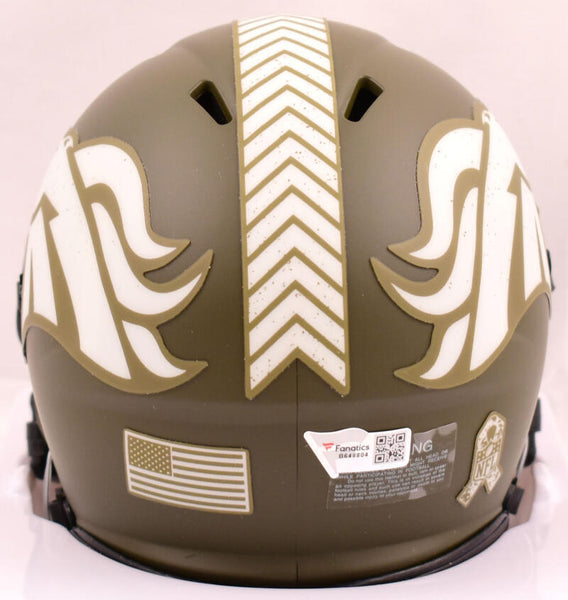 Peyton Manning Autographed Denver Broncos Salute to Service Speed Mini Helmet-Fanatics *Orange This is a hand autograph of Peyton Manning of the Denver Broncos on a Riddell Football Salute to Service Speed Mini Helmet. This item has a Fanatics Authentication, which comes with a numbered sticker hologram and a QR code for authentication. You can view this item on the Fanatics Authentication website and it shows when and where the item was signed. It was signed either at a public autograph appearance or a private signing. This is a stock photo of the item. Although you may not receive this exact item, the item you receive is virtually identical and brand new in great shape.