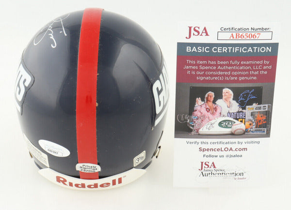 Riddell New York Giants mini-helmet. Hand-signed in silver felt-tip pen by Phil Simms (Giants).The autograph includes an official JSA hologram and matching COA for authenticity purposes.Authentication: JSA COA