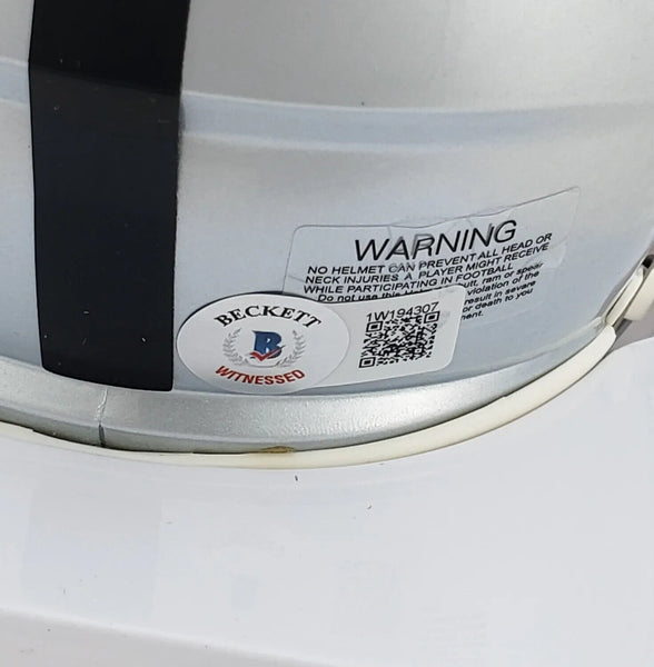 This autographed Riddell Speed mini helmet has been personally hand-signed by Raghib Rocket Ismail of the Oakland Raiders.This autograph is certified by Beckett Authentication Services (BAS) Witness Certification. That means that a Beckett representative was present when this item was signed. It comes with the numbered authentication hologram with a QR code that verifies the authentication on the Beckett website.