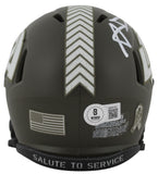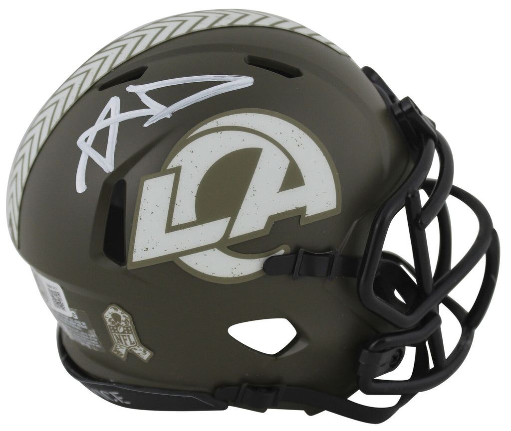 This Autographed Alternate Salute To Service Speed Mini Helmet has been Personally Signed by Aaron Donald of the Los Angeles Rams. This item is 100% Authentic to include a hologram by Beckett Authentication Services. This item will come with an affixed Beckett Authentication Services (BAS) authentication sticker, which includes a scannable QR code to verify authenticity. Please note that Beckett no longer provides serial-numbered COA cards, and the attached BAS sticker will serve as the complete authentication for this item. This is a BAS Witnessed Protection Program item which means a Beckett Authentication Service representative was present when this item was being signed. We conducted an autograph signing with Aaron Donald where multiples of the same item were signed. While the photographs are representative of this item, the size, placement and strength of the signature may vary. Each item is hand signed, therefore, each autograph is unique. This item can be verified through BAS Witnessed.