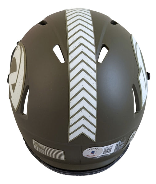 This Autographed Alternate Salute To Service Speed Mini Helmet has been Personally Signed by Marshall Faulk of the St. Louis Rams. This item is 100% Authentic to include a hologram by Beckett Authentication Services. This item may come with the new Beckett Authentication hologram that has a scannable QR code rather than the traditional COA. If you would like to have a COA, you are welcome to reach out to Beckett for a printed certification once you receive your item. This is a BAS Witnessed Protection Program item which means a Beckett Authentication Service representative was present when this item was being signed. We conducted an autograph signing with Marshall Faulk where multiples of the same item were signed. While the photographs are representative of this item, the size, placement and strength of the signature may vary. Each item is hand signed, therefore, each autograph is unique. This item can be verified through BAS Witnessed.