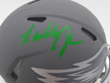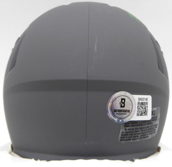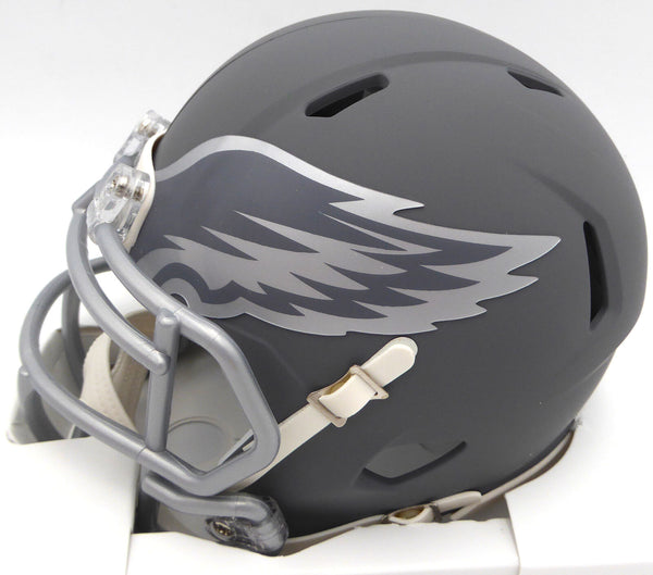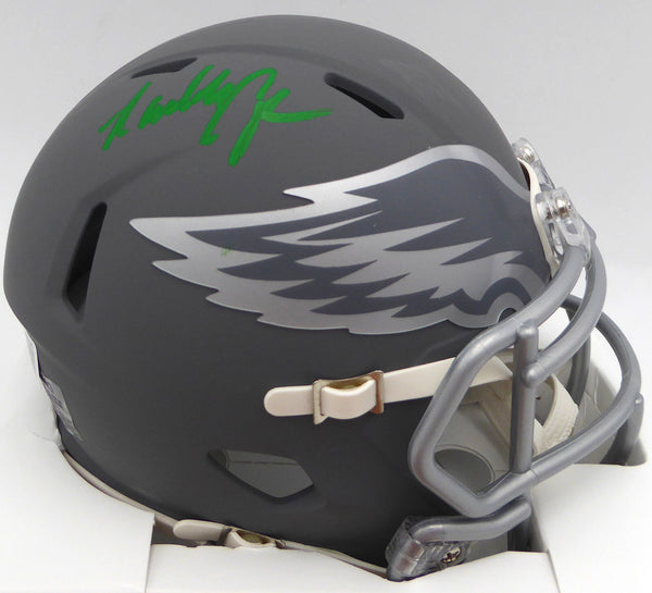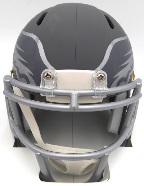 This is a Philadelphian Eagles Slate Gray Mini Helmet that has been hand signed by Randall Cunningham. This item has been certified authentic by Beckett Authentication (BAS) and comes with their tamper-proof QR Code sticker that can be verified on the Beckett-authentication.com.
