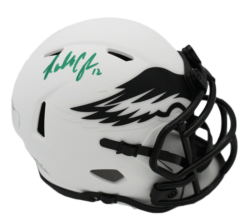 A Philadelphia Eagles Speed Lunar NFL Mini Helmet hand signed by Randall Cunningham. The item and signature are in excellent condition. Randall is a former quarterback who played in the NFL for 16 seasons, primarily with the Philadelphia Eagles. A four-time Pro Bowl selection and two-time first-team All-Pro, Cunningham is also known for his tenure with the Minnesota Vikings. AUTHENTICATION: The item is accompanied by a Certificate of Authenticity - Serial Numbered and Databased Hologram - Picture of Randall from the signing