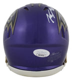 This Autographed Alternate Flash Speed Mini Helmet has been Personally Signed by Kyle Hamilton of the Baltimore Ravens. This item is 100% Authentic to include a Certificate of Authenticity (COA) / hologram by JSA Witness. This is a JSA Witnessed Protection Program item which means a JSA representative was present when this item was being signed. We conducted an autograph signing with Kyle Hamilton where multiples of the same item were signed. While the photographs are representative of this item, the size, placement and strength of the signature may vary. Each item is hand signed, therefore, each autograph is unique. This item can be verified through JSA Witness.
