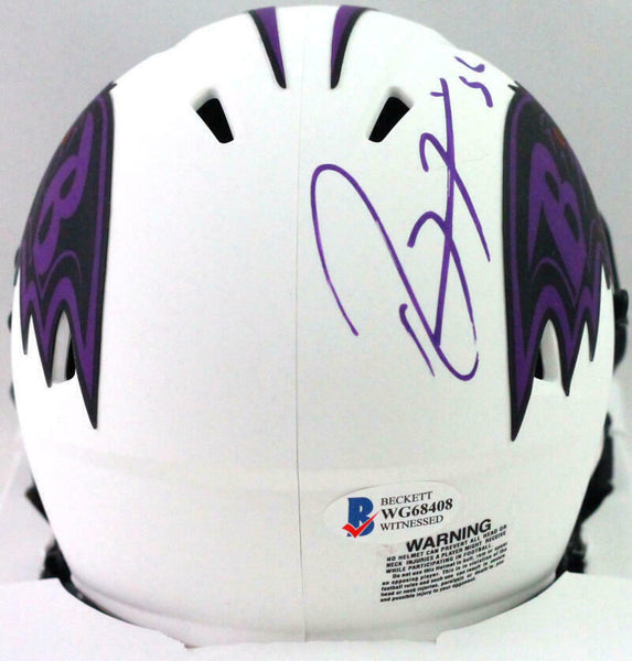 Ray Lewis Autographed Baltimore Ravens Lunar Mini Helmet- Beckett W *Silver This is a hand autograph of Ray Lewis of the Baltimore Ravens on a Riddell Football Lunar speed Mini Helmet. This item has a Beckett Witnessed Authentication, which comes with a numbered and a matching Beckett Certificate of Authenticity. You can view this item on the Beckett Authentication website, it shows when and where the item was signed. It was signed either at a public autograph appearance or a private signing. This is a stock photo of the item. Although you may not receive this exact item, the item you receive is virtually identical, brand new, and in great shape.