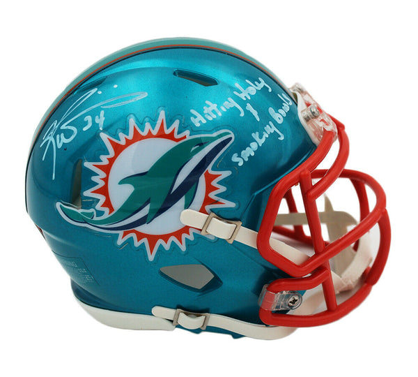 A Miami Dolphins Speed Flash NFL Mini Helmet hand signed by Ricky Williams. The item and signature are in excellent condition. In addition to signing his name, Ricky also inscribed "Hitting Holes & Smoking Bowls" on the item. Ricky is a former American football running back who played 11 seasons in the NFL. Ricky played college football for the University of Texas, where he was a two-time All-American and won the Heisman Trophy. Ricky was drafted by the New Orleans Saints before being traded to the Miami Dolphins. He also spent a season with the Baltimore Ravens. AUTHENTICATION: The item is accompanied by a Ricky Williams Exclusive Certificate of Authenticity - Ricky Williams Exclusive Serial Numbered and Databased Hologram - Picture of Ricky from the Signing