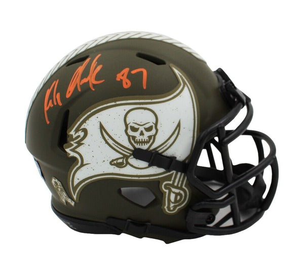 A Tampa Bay Buccaneers Speed Salute To Service NFL Mini Helmet hand signed by Rob Gronkowski. The item and signature are in excellent condition. Rob is a 5x All-Pro First Team, 5x Pro Bowler, and 2x Super Bowl Champion. AUTHENTICATION: Your item is tagged with a Rob Gronkowski exclusive SmarTag powered by Prova Technology, which gives you digital access to your items authentication records, which includes a proof picture from the signing.